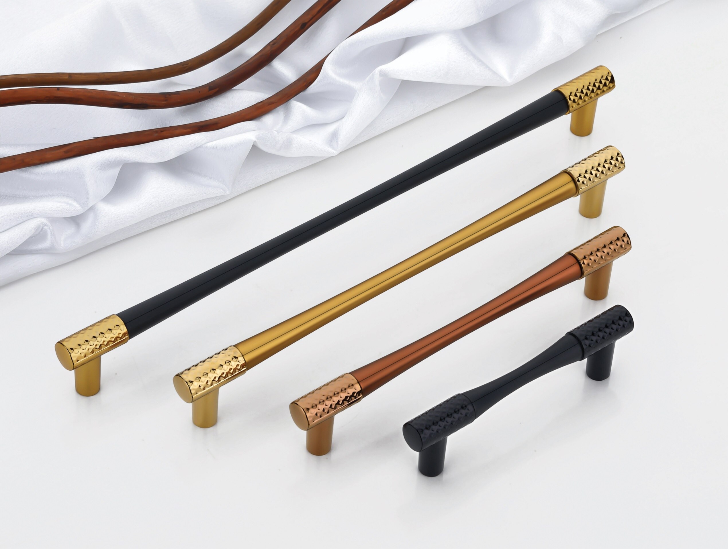 Elegant cabinet handles, showcase a sleek, modern design with contrasting metallic accents. Available in finishes such as matte black, brass, and potentially PVD for enhanced durability and a premium look. While these are cabinet handles and not door locks, the high-quality construction suggests corrosion-resistant materials. The design emphasizes a clean aesthetic. Keywords like sleek design and premium hint at their market positioning. Though not applicable to cabinet handles, keywords like brass cylinder and computerized keys of brass are irrelevant here. Similarly, a fully covered lower body is a feature of door handle locks, not cabinet handles. The brass finish is evident in some variants, while the black appears to be a matte finish. PVD finish may be present for added durability