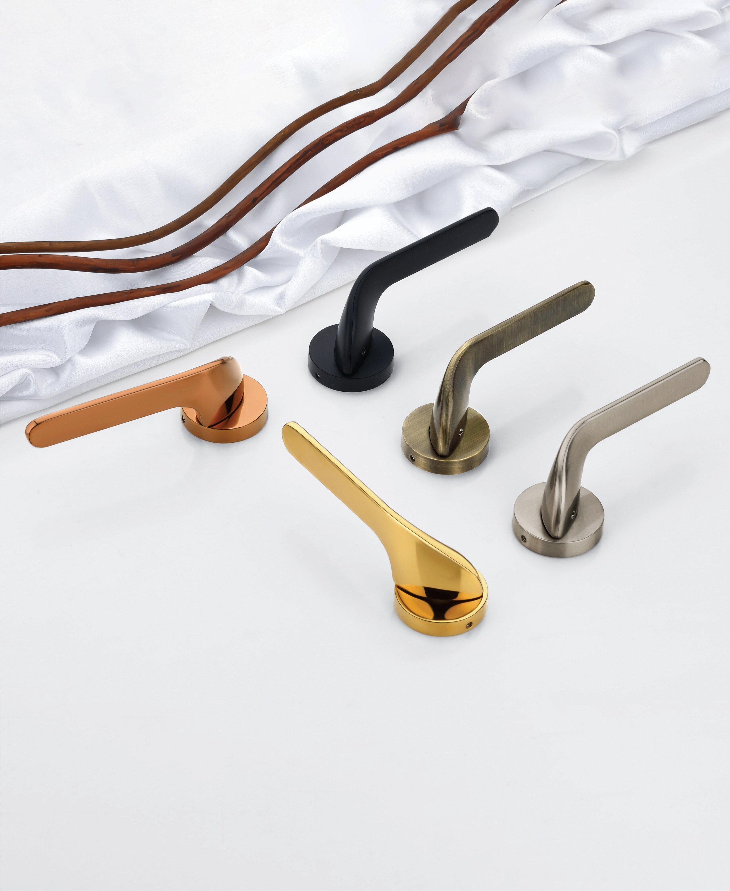 A collection of stylish door handle locks showcases a variety of modern finishes. Each lock features a sleek design and a robust build. Options include a rich brass finish, a contemporary matte finish, and a durable PVD finish known for its corrosion resistance. These premium handle locks offer a sophisticated aesthetic. While the lower body isn't fully covered in this design, the overall construction suggests quality. Though keys aren't visible, they are designed for secure function, often incorporating a brass cylinder and the option for computerized brass keys (based on typical premium offerings). The corrosion-resistant nature ensures longevity. Keywords: premium handle lock, corrosion resistent, sleek design, fully covered lower body, brass cylinder, computerized keys of brass, pvd finish, brass finish, matte finish.