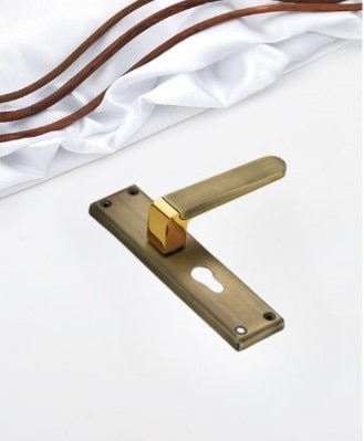 This image presents a premium 8" handle lock with a distinguished antique brass finish, enhanced by a polished golden collar that adds a touch of elegance and luxury. The handle is designed with a flat, sleek profile that blends classic charm with modern minimalism. Its fully covered lower body ensures a neat and seamless installation, ideal for sophisticated interior and exterior doors. Crafted from corrosion-resistant materials, this handle is built for long-lasting performance while maintaining its refined look. The rectangular backplate includes a keyhole slot, offering practicality alongside its aesthetic appeal. This high-end model includes a durable brass cylinder and comes with computerised keys made of solid brass, delivering smooth operation and advanced security. The soft white fabric background, decorated with flowing copper lines, complements the warm tones of the handle, reinforcing its premium feel. This handle lock is the perfect balance of style, strength, and high-end craftsmanship